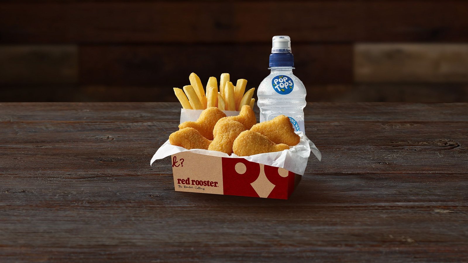 6 cheesy chicken nuggets, a serve of our famous chips or peas and a kids drinkKids 6 Cheesy Nuggets Meal$9.753363kJ