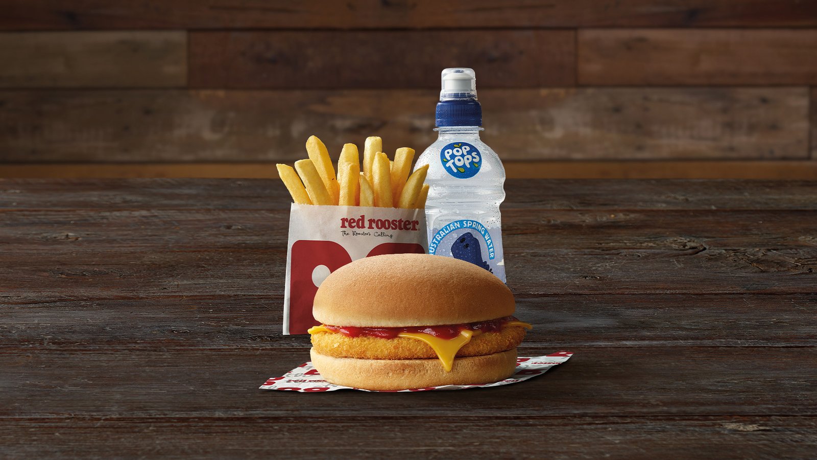 Kids Cheeseburger, a serve of our famous chips or peas and a kids drinkKids Cheeseburger Meal$8.253123kJ